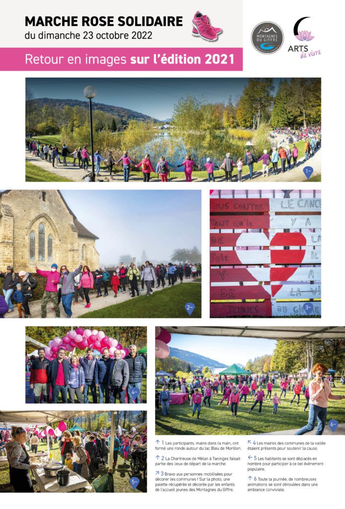 A l’occasion d’Octobre Rose, mois national d’information et de sensibilisation au dépistage du cancer du sein, l’association Arts de Vivre organise pour la 3ème année consécutive une marche rose solidaire le dimanche 23 octobre 2022, en partenariat avec la Communauté de Communes des Montagnes du Giffre, les huit communes du territoire et plusieurs associations locales.