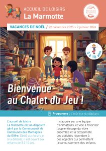 L’accueil de loisirs la Marmotte (3-10 ans) ouvrira ses portes du lundi 22 décembre 2025 au vendredi 2 janvier 2026.
