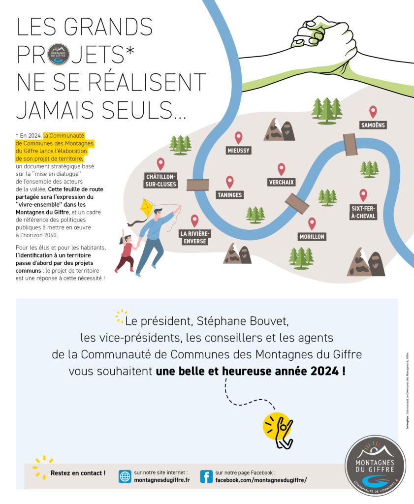 Le président, Stéphane Bouvet, les vice-présidents, les conseillers et les agents de la Communauté de Communes des Montagnes du Giffre vous souhaitent une belle et heureuse année 2024 !