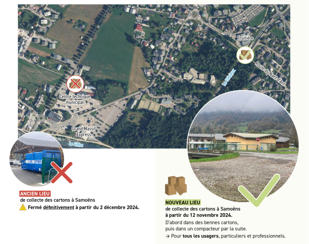 A partir du mardi 12 novembre 2024 à Samoëns, les usagers – particuliers et professionnels – qui avaient l’habitude de déposer leurs cartons au centre technique municipal (CTM), devront désormais se rendre à proximité des conteneurs aériens de la route du Nant d’Ant, sur la rive gauche du Clévieux.