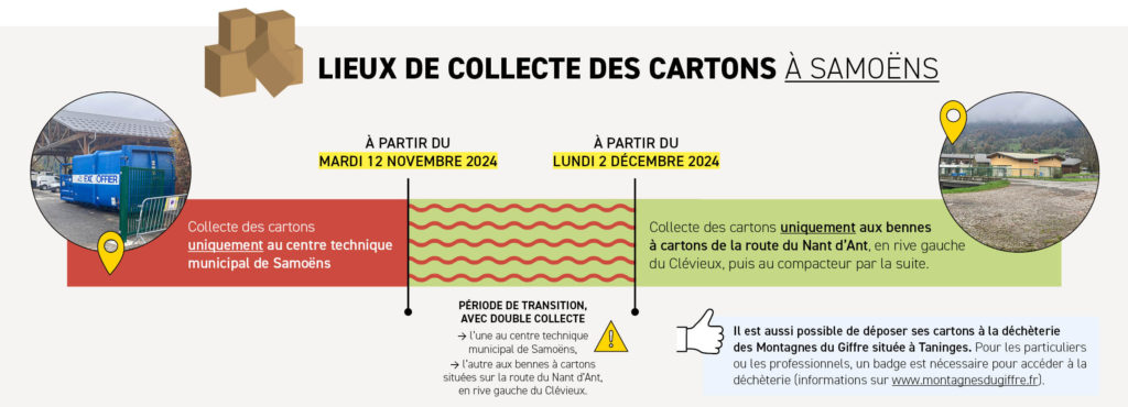 NB : Il est aussi possible de déposer les cartons à la déchèterie des Montagnes du Giffre située à Taninges. Pour les particuliers ou les professionnels, un badge est nécessaire pour accéder à la déchèterie. Informations → sur cette page.