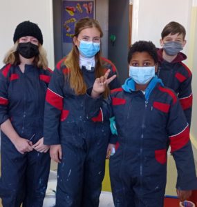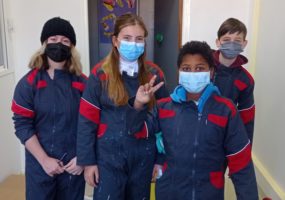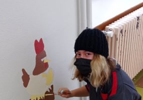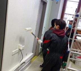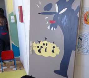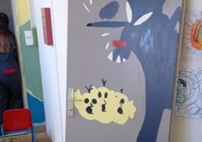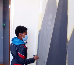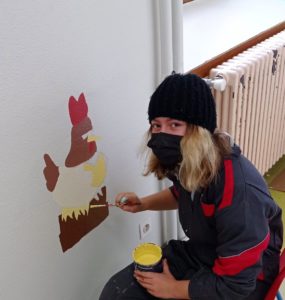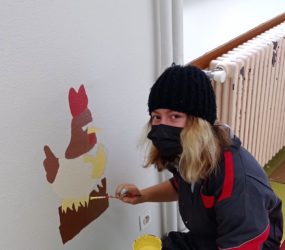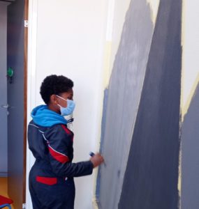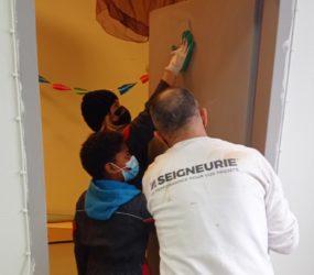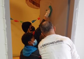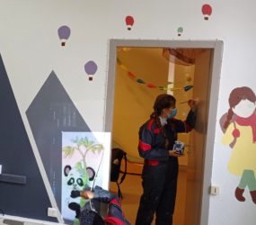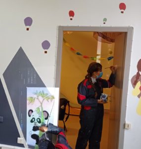 Bien encadrés par Lucien, animateur de l’accueil jeunes, et par deux peintres professionnels, Angèle, Basile, Louane et Maxime ont d’abord passé les premières couches de peinture blanche sur les murs, les portes et les plaintes ‘’pour donner davantage de luminosité à la pièce’’. Ensuite, les adolescents ont imaginé des illustrations et des motifs ‘’chaleureux et apaisants’’ avant de les reproduire sur les murs avec l’aide de pochoirs.