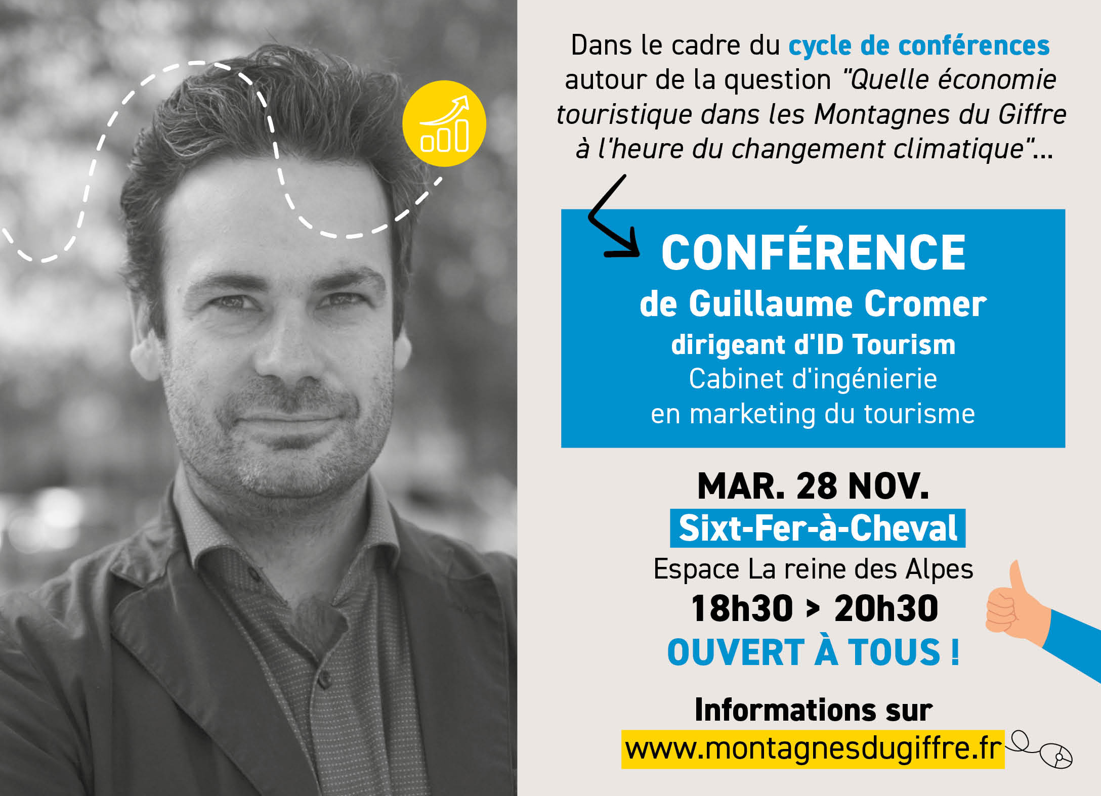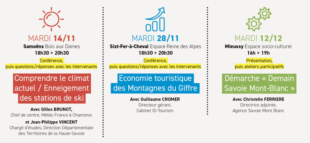 Afin d’élaborer ensemble des solutions d’avenir pour notre territoire, la Communauté de Communes des Montagnes du Giffre, compétence sur les questions de la « promotion du tourisme » et du « développement économique », organise un cycle de conférences et d’ateliers en novembre / décembre sur le thème « Quelle économie touristique pour notre territoire à l’heure du changement climatique ? ».