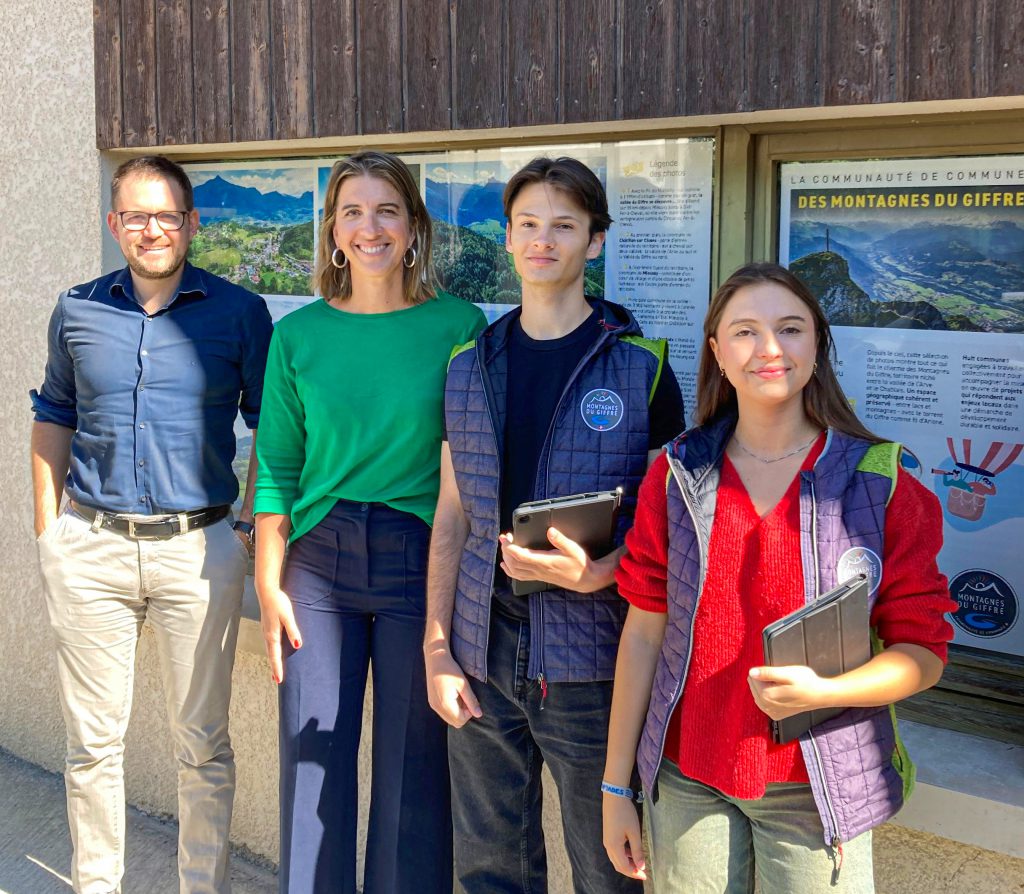 Cloé et Matias, les deux enquêteurs (sur la droite), en compagnie de Lise LOPES responsable de la promotion du tourisme à la Communauté de Communes et Romaric JUVANON, responsable du service adaptation du territoire à la Communauté de Communes.