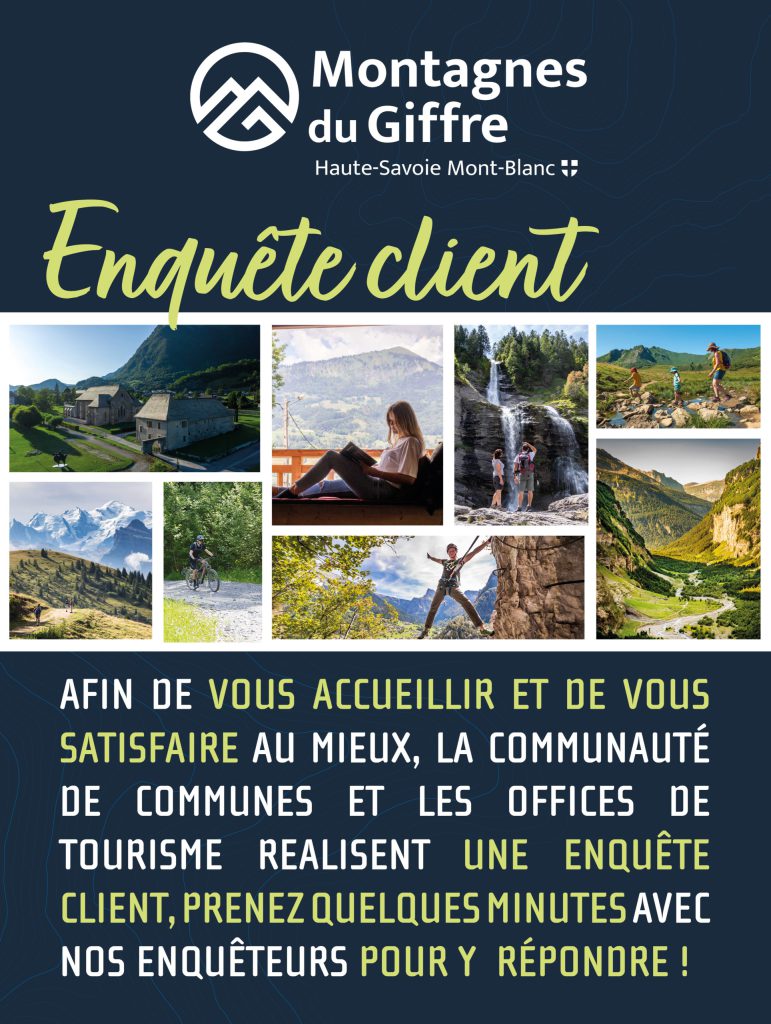 Dans le cadre d’une étude (en cours) sur la gestion des flux touristiques, la Communauté de Communes des Montagnes du Giffre, avec l’appui des Offices de Tourisme, poursuit son enquête auprès de la clientèle en séjour du lundi 7 juillet au dimanche 17 août 2025.