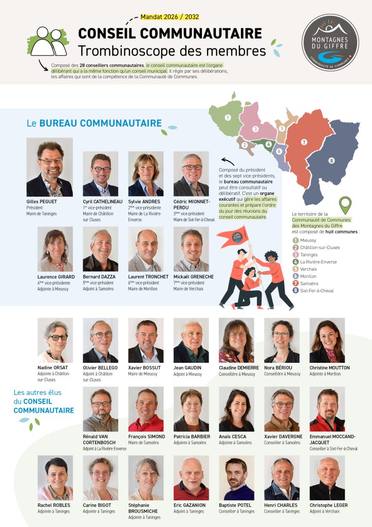 Pour clôturer ce premier conseil, le nouveau président a donné lecture de la charte de l’élu local, puis donné rendez-vous au mercredi 29 avril 2026 au siège de la Communauté de Communes à Taninges pour le 2e conseil communautaire du mandat. La séance sera notamment consacrée à la composition des commissions de travail thématiques et la représentation dans les instances extérieures, telles que le SYndicat des Déchets, de l’Eau et de la VALorisation (SYDEVAL), le Syndicat Mixte d’Aménagement de l’Arve et de ses Affluents (SM3A), la Société d’Economie Alpestre (SEA) de Haute Savoie, l’Etablissement Public Foncier (EPF), les Offices de Tourisme Intercommunaux (OTI), etc…