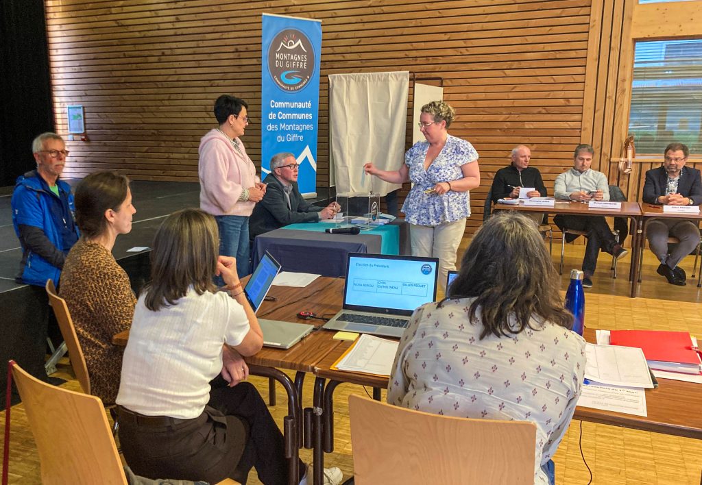 Devant les vingt-huit représentants des huit communes composant l’intercommunalité, le premier point à l’ordre du jour a donc été l’élection du président. C’est le doyen de l’assemblée, Jean Gaudin, conseiller municipal à Mieussy, qui a présidé l’élection. Comme attendu, deux candidats briguaient le poste de président, Cyril Cathelineau, maire de Châtillon-sur-Cluses, et Gilles Peguet, maire de Taninges, tandis que Nora Bériou, conseillère à Mieussy, proposait une inattendue « 3e voie » en appelant à voter pour Sylvie Andrès, maire de la Rivière-Enverse. Celle-ci, bien qu’honorée de l’intention, indiqua qu’elle avait « toute confiance en Cyril ou Gilles pour porter avec ambition et sincérité la présidence de l’intercommunalité » et que par conséquent elle n’était pas candidate.