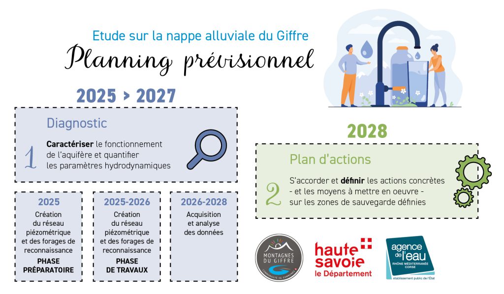 Pour cela, “nous engageons le territoire dès l’été 2025 dans une vaste étude qui va durer près de trois ans et se dérouler en deux phases. La première, la plus longue, permettra de recueillir des données à l’échelle de la nappe pour caractériser le fonctionnement de l’aquifère. Pour cela, il est prévu la création d’un important réseau piézométrique et trois forages profonds (80 mètres) entre Taninges et Samoëns”. La seconde phase débutera fin 2027, et consistera à valider collectivement les actions et mesures de protection à engager localement ; elles seront notamment retranscrites dans les documents réglementaires, d’urbanisme (SCOT, PLU) et de planification.
