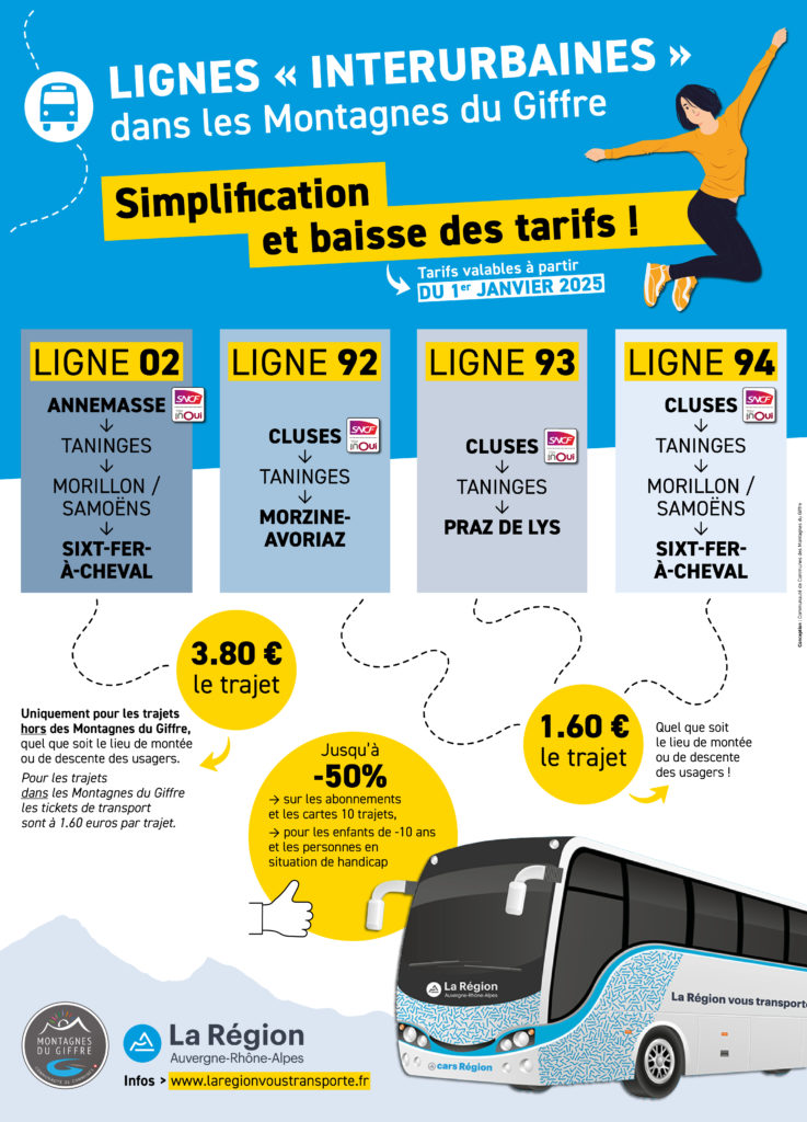 Bonne nouvelle pour les habitants de la vallée ! Depuis le 1er janvier 2025, la grille tarifaire des lignes interurbaines Y02, Y92, Y93 et Y94, celles qui desservent le territoire des Montagnes du Giffre, est simplifiée avec l’application d’un tarif unique.