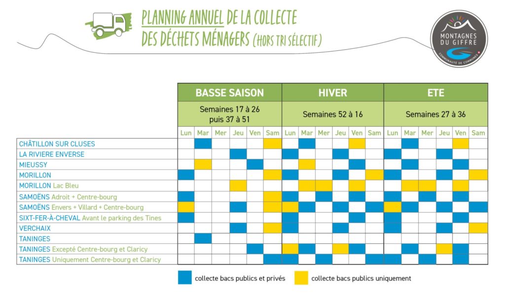 A partir de ce lundi 20 décembre 2021, le rythme de la collecte des ordures ménagères sur le territoire des Montagnes du Giffre passera en période ”HIVER”. Cette modification est liée au début de la saison touristique synonyme de hausse de la fréquentation et de d’augmentation du volume de déchets à collecter. Vous trouverez ci-dessous le nouveau planning de collecte des déchets ménagers (hors tri sélectif).