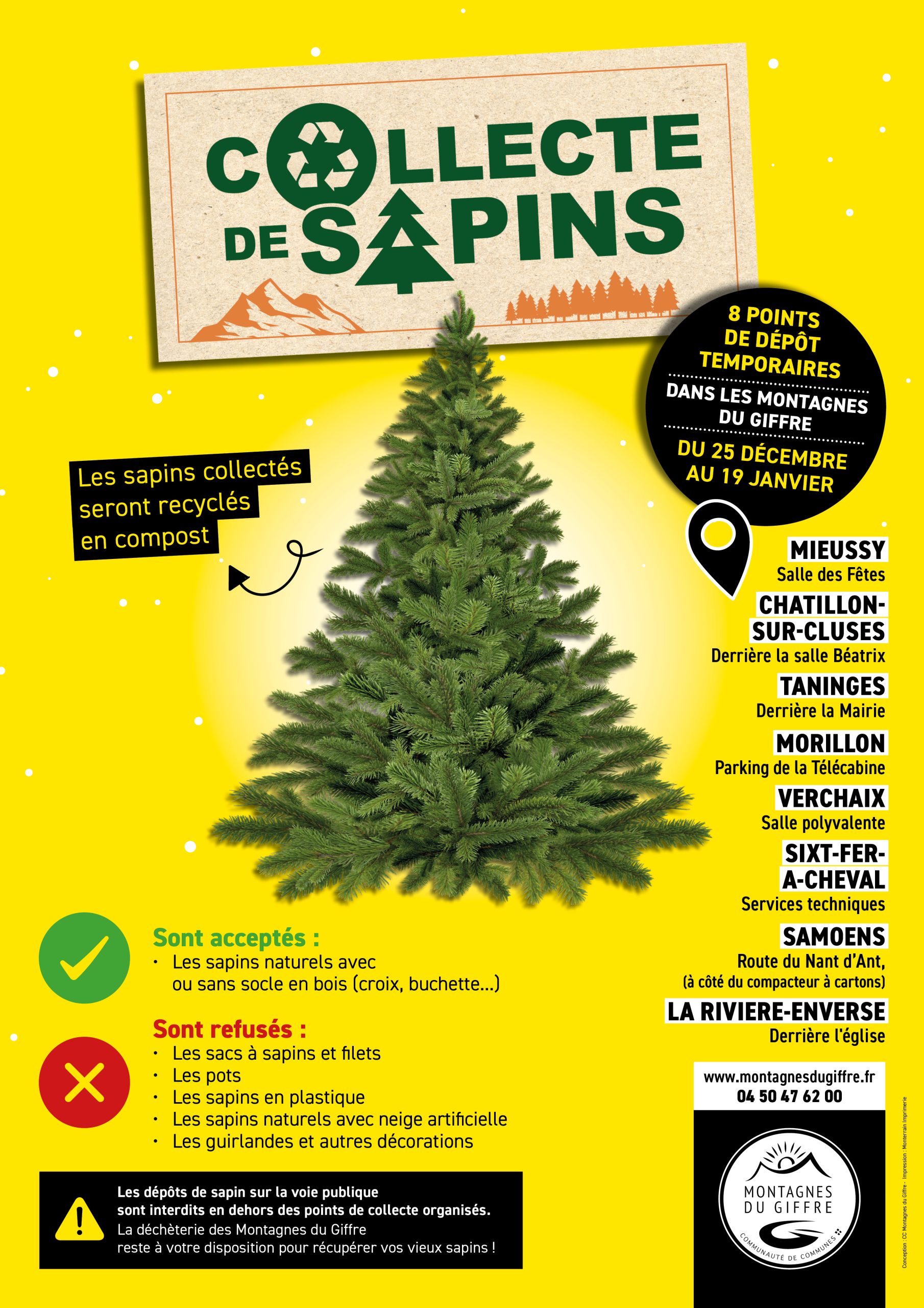 En dehors de ces points de collecte, votre sapin doit être exclusivement déposé à la déchèterie des Montagnes du Giffre (ouverture du lundi au samedi, de 8h30 à 12h et de 14h à 17h – fermeture les dimanches et jours fériés).