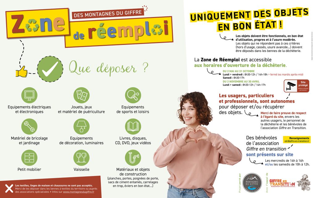 Des bénévoles de l’association Giffre en Transition, partenaire dans la mise en place de ce nouveau dispositif, seront présents sur site le mercredi de 14h à 16 et/ou le samedi de 10h à 12h, “notamment pour trier et ranger, mettre dans les bennes de la déchèterie les objets trop abimés ou inutilisables, échanger avec les usagers sur le fonctionnement du lieu…”.
