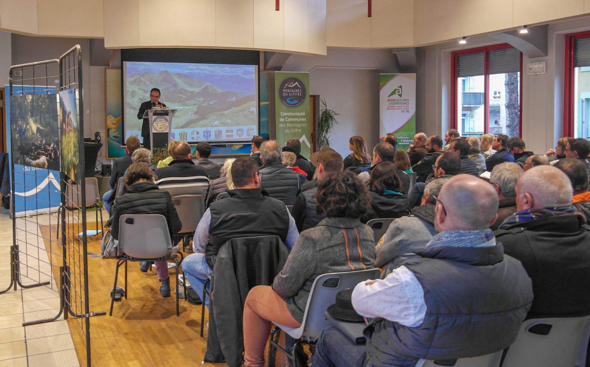 Stéphane Bouvet a détaillé les actions menées par la Communauté de Communes en matière environnementale. Il est notamment revenu sur le Plan Pastoral Territorial (PPT), animé localement par la Communauté de Communes depuis 2013, ainsi que sur les aides du Département dans le cadre de sa politique des Espaces Naturels Sensibles. ‘’Ces dispositifs financiers sont une opportunité pour le territoire de structurer son soutien en faveur du pastoralisme. Ils répondent à de nombreux besoins agricoles dont l’amélioration des conditions de travail sur les alpages’’. Il a ensuite précisé que les enveloppes du nouveau PPT – renouvelé en 2019 jusqu’en 2024 – étaient déjà fortement consommées, ‘’à hauteur de 80%, ce qui représente un total de 635 000 euros de projets réalisés ou en cours de réalisation depuis 3 ans. Au vu des besoins qui persistent localement et des contraintes qui pèsent sur certains alpages (prédation, manque d’eau, partage des espaces…), la Communauté de Communes s’engage a sollicité la Région prochainement afin d’éviter une période blanche jusqu’en 2024’’.