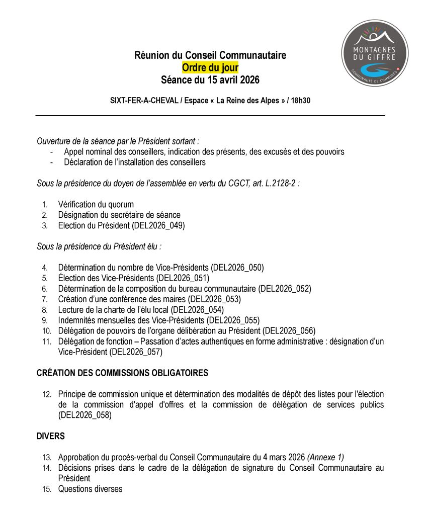 La prochaine séance du conseil communautaire se déroulera le mercredi 15 avril 2026 à Sixt-Fer-à-Cheval, à l’Espace « La Reine des Alpes ». Venez vous informer et participer aux décisions qui impactent notre territoire !