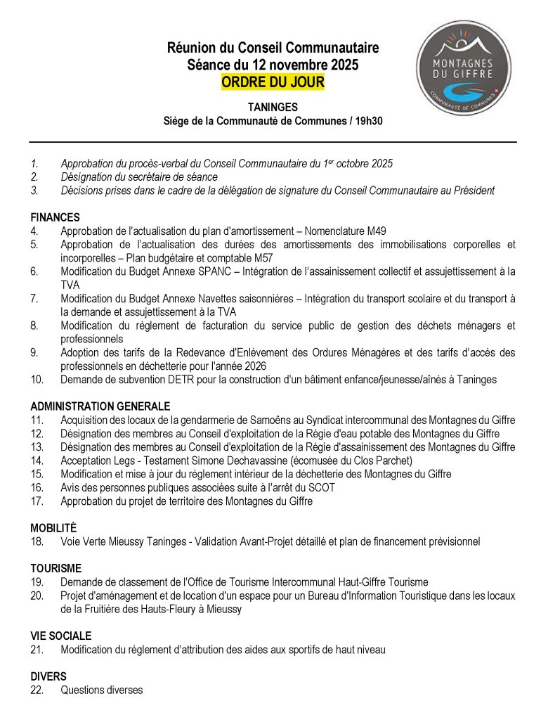 La prochaine séance du conseil communautaire se déroulera le mercredi 12 novembre 2025 au siège de la collectivité à Taninges. Venez vous informer et participer aux décisions qui impactent notre territoire !