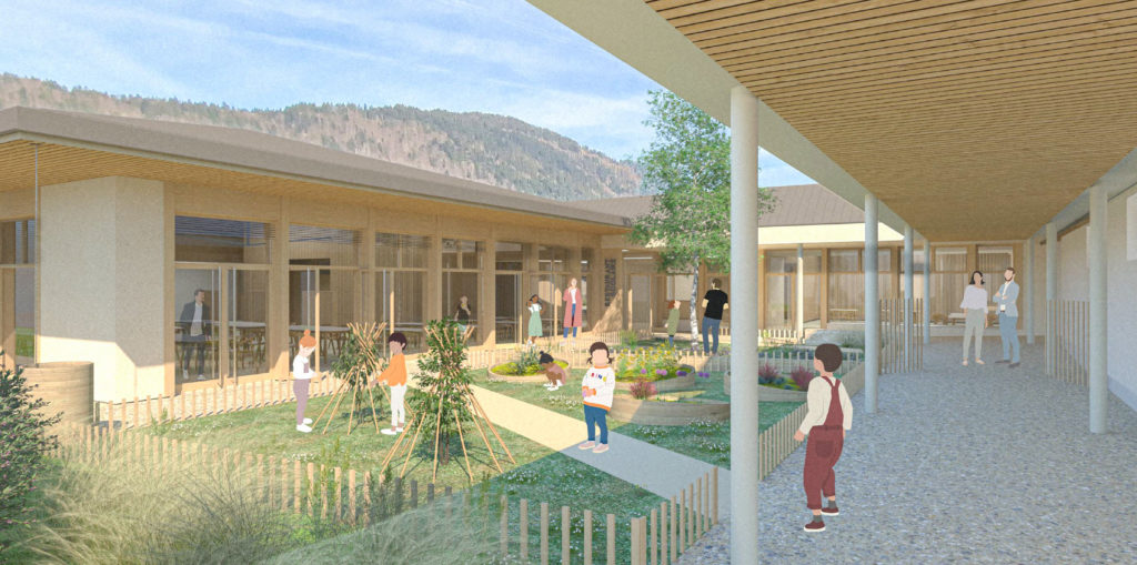 Ce projet mutualisé avec la commune de Taninges en raison des compétences partagées, regroupera la crèche des P’tits Bouts, la cantine scolaire, le Relais Petite Enfance, le CLAP Jacquemard, ainsi qu’un accueil sur le temps du déjeuner pour les ainés.