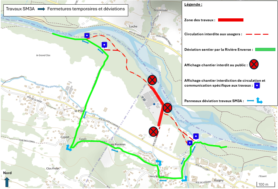 En amont des travaux, les agents du service de “gestion des sentiers” de la Communauté de Communes sont intervenus pour installer des déviations sur les chemins environnants (voir plan ci-dessus), et ainsi permettre la continuité des itinéraires le long du Giffre ou à proximité immédiate. La Communauté de Communes vous remercie de bien vouloir respecter la signalétique mise en place sur le terrain, pour votre sécurité et celle de vos proches.