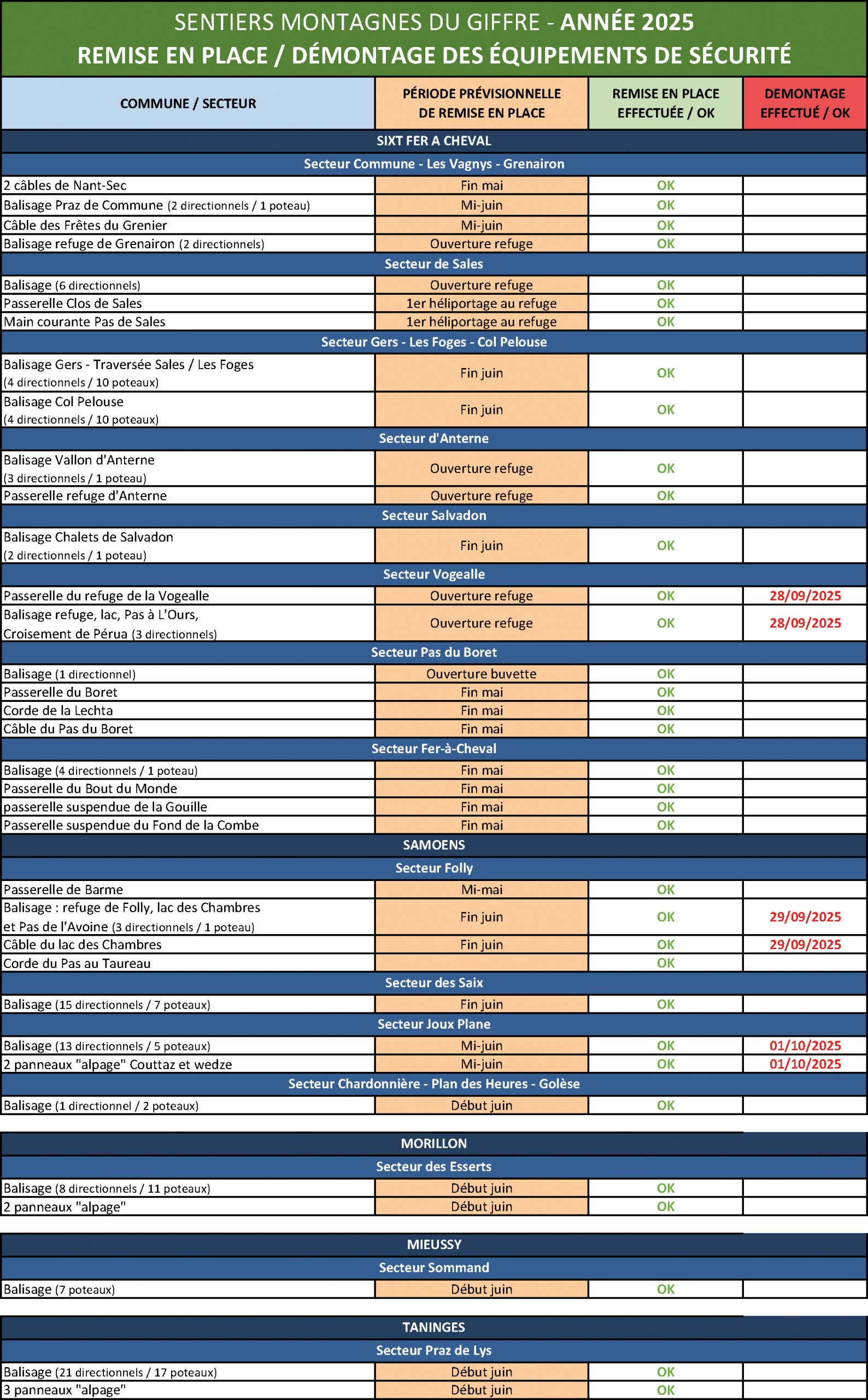 Chaque année au printemps (en mai et juin), les agents du service de gestion des sentiers remettent en place progressivement certains équipementsde sécurité (passerelles, câbles, panneaux directionnels…) retirés à l’automne, car soumis aux contraintes de la neige ou situés sur les pistes de ski.