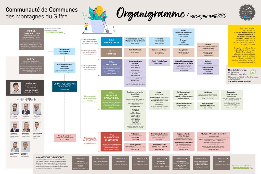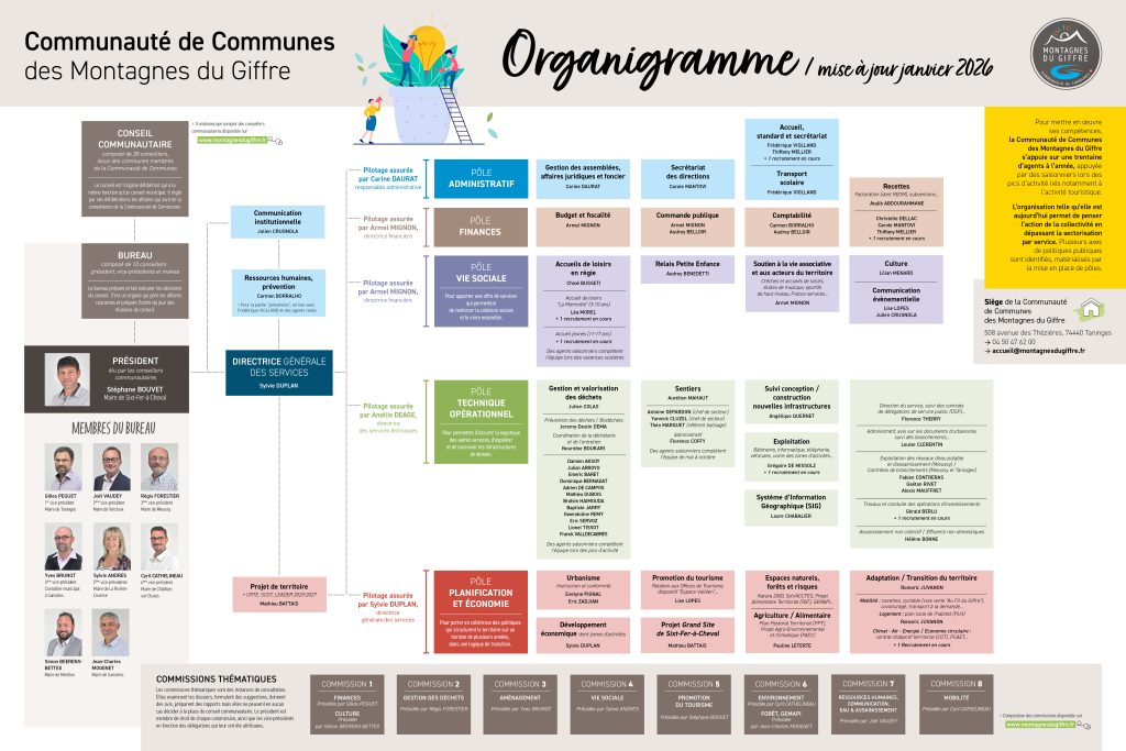 Pour mettre en œuvre ses compétences, la Communauté de Communes des Montagnes du Giffre s’appuie sur une trentaine d’agents à l’année, appuyée par des saisonniers lors des pics d’activité liés notamment à l’activité touristique.