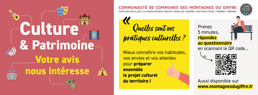 La Communauté de Communes, par la voix de son conseiller communautaire délégué à la culture, Simon Beerens-Bettex, « remercie chaleureusement les personnes qui ont pris le temps de répondre à l’enquête. Votre participation nous apporte de précieuses informations quant à vos usages et vos attentes en matière d’offre culturelle dans les Montagnes du Giffre. Je remercie également les partenaires qui contribuent à la réussite de cette démarche : l’agence AGATE qui accompagne la collectivité, les mairies et les associations du territoire, les acteurs privés… qui jouent notamment un rôle de relai indispensable auprès de la population ».