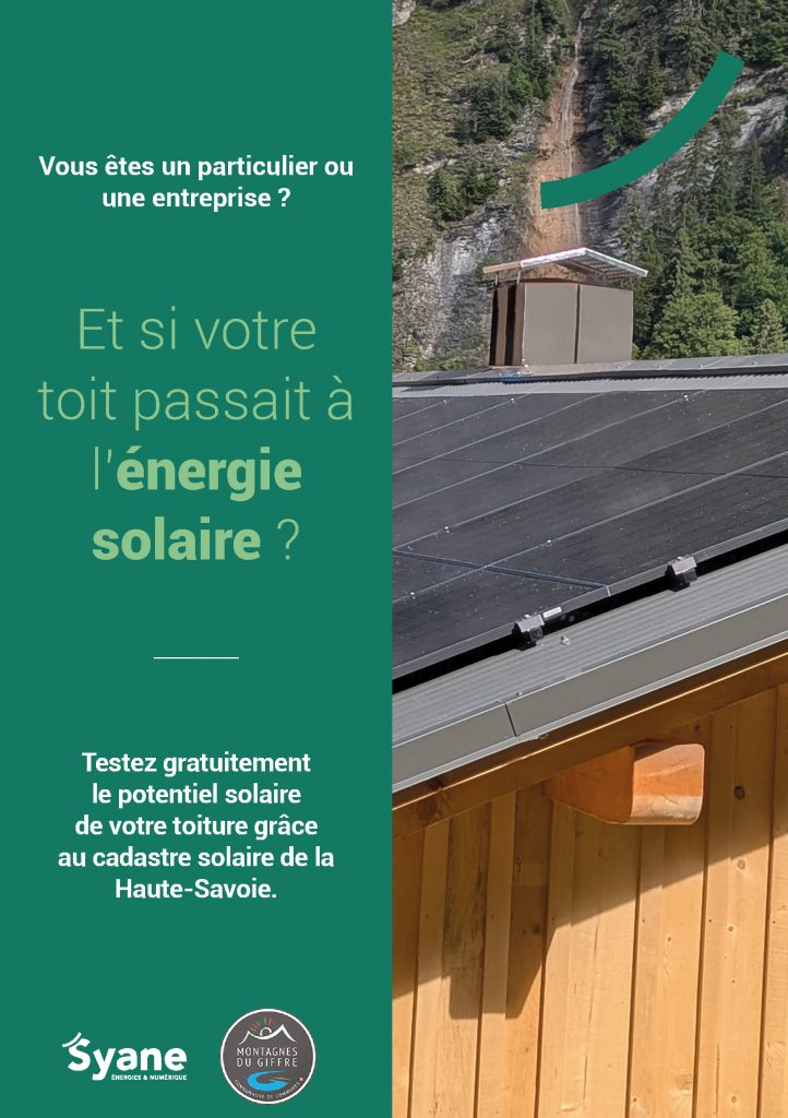 Le cadastre solaire du Syndicat des énergies et de l’aménagement numérique de la Haute-Savoie (SYANE) est un outil en ligne gratuit et interactif permettant aux particuliers et professionnels d’évaluer le potentiel solaire de leur toiture. En quelques clics, il offre une cartographie précise de l’ensoleillement des toitures sur l’ensemble du département de la Haute-Savoie, dont le territoire des Montagnes du Giffre.